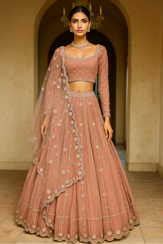 Indulge in elegance with this stunning ensemble, perfect for any occasion. Boasting a unique Light Bronze Red hue and detailed silver embroidery, this lehenga is sure to captivate all eyes. Meticulously handcrafted with luxurious fabrics, adorned with delicate pearls and stones, this masterpiece exudes opulence and sophistication. Immerse yourself in the latest fashion with this gorgeous and regal lehenga fit for royalty.