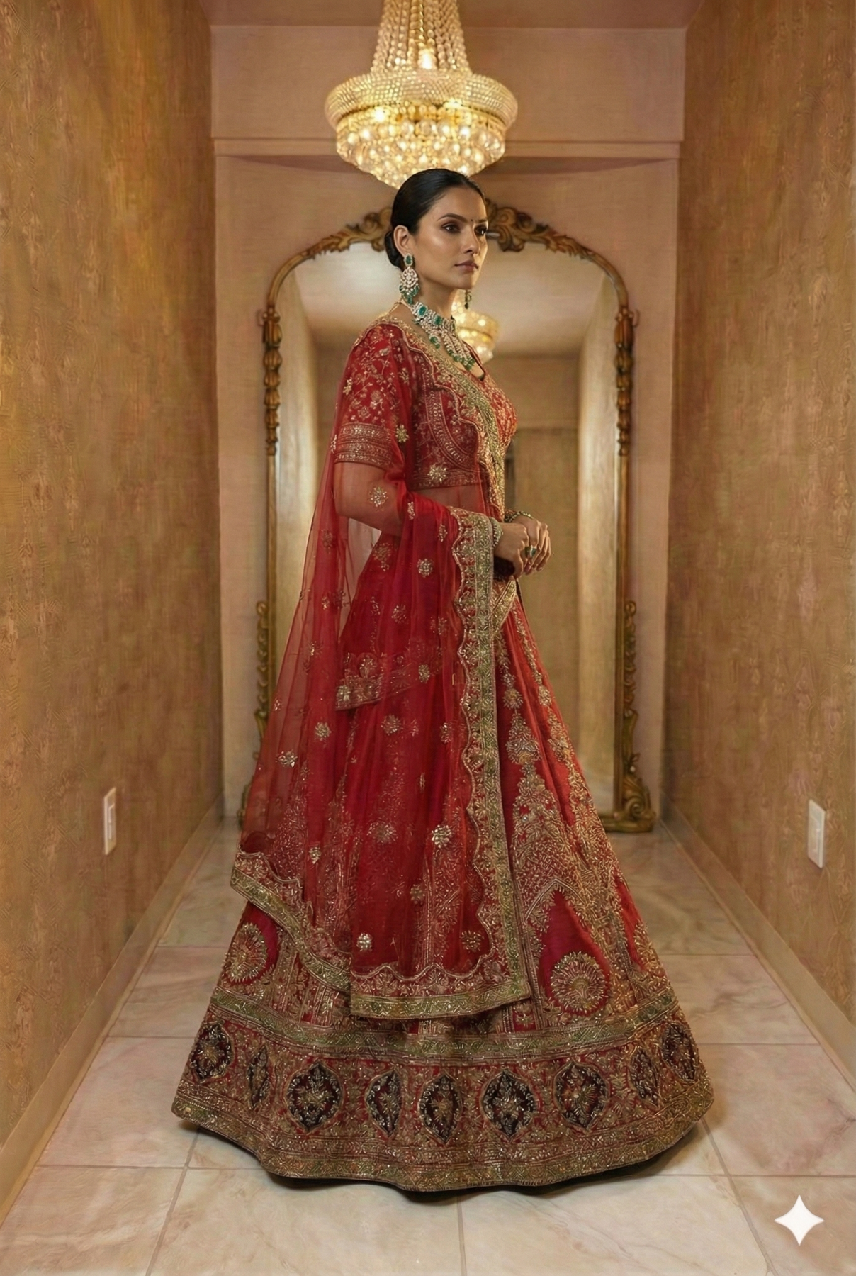 Embrace royalty on your special day with this masterpiece from VAMA DESIGNS. This crimson red bridal lehenga features a breathtaking combination of architectural arches and peacock motifs, meticulously brought to life with heavy golden Zardosi and thread work. Paired with a matching embroidered blouse and a sheer net dupatta with heavy borders, this ensemble defines traditional Indian grandeur.
