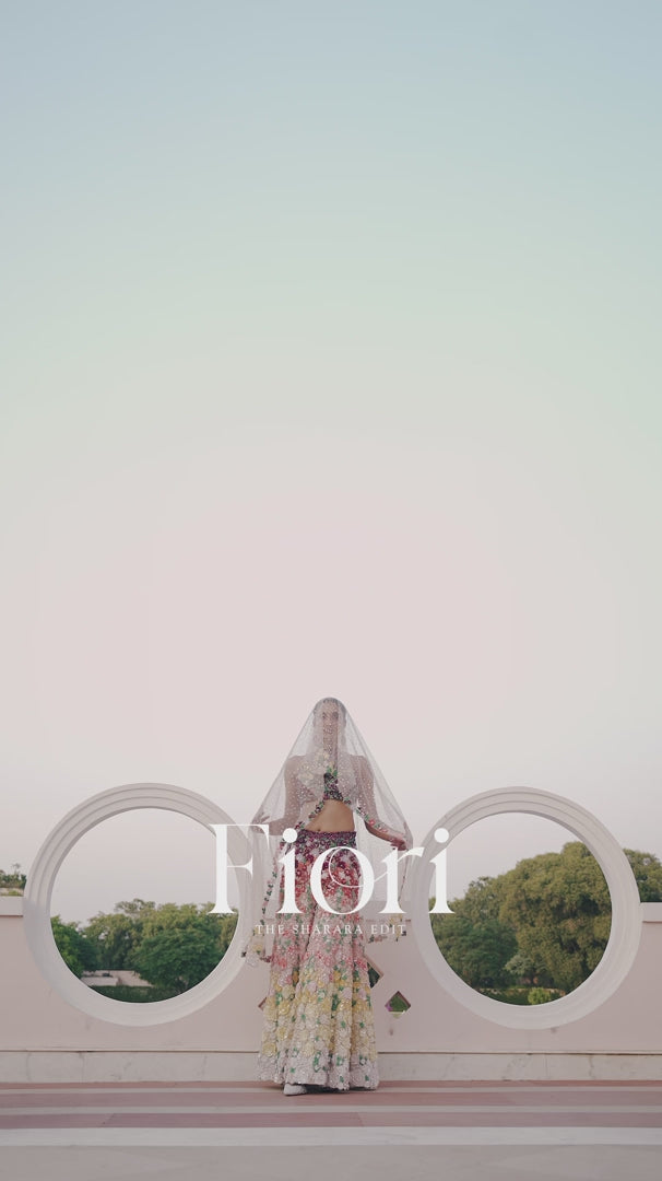 This sharara set features heavily embroidered three-dimensional embroidery in tones of ivory to yellow to peaches to pinks to plums. The 3D flowers are further accentuated with crystal, bugle beads and platinum cut sequins. The halter blouse is fully embroidered. It is paired with an embroidered dupatta with a matching border and floral motifs all over.