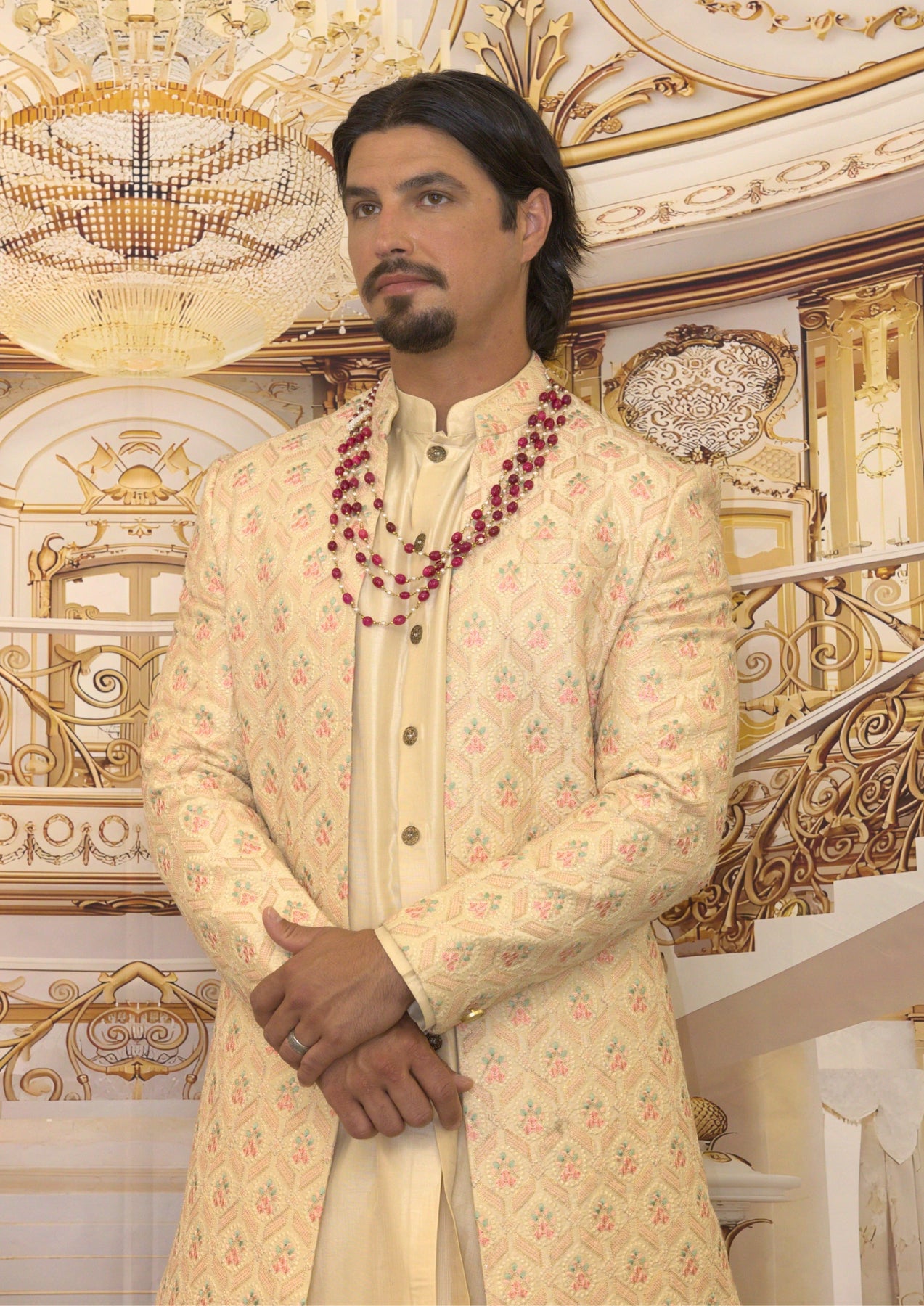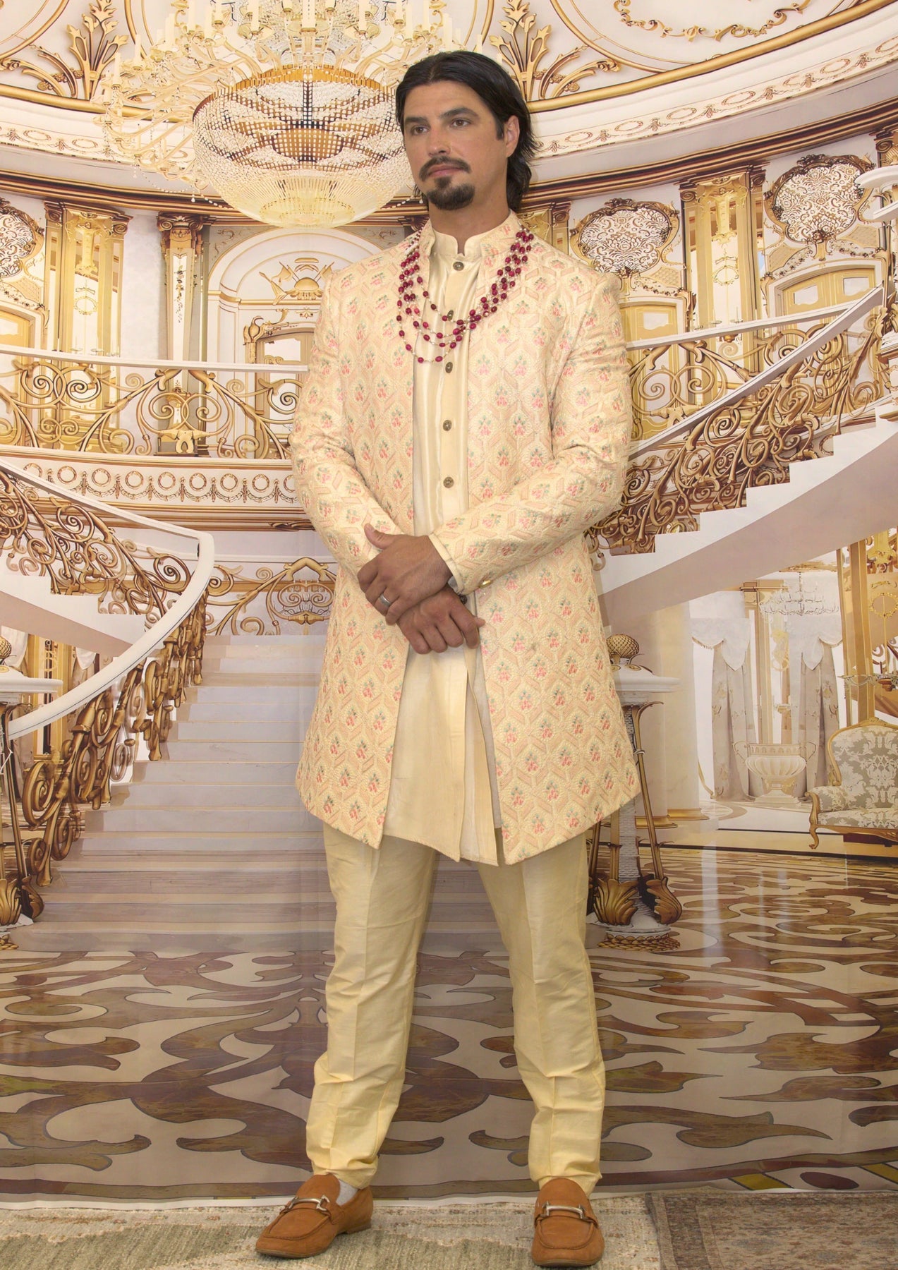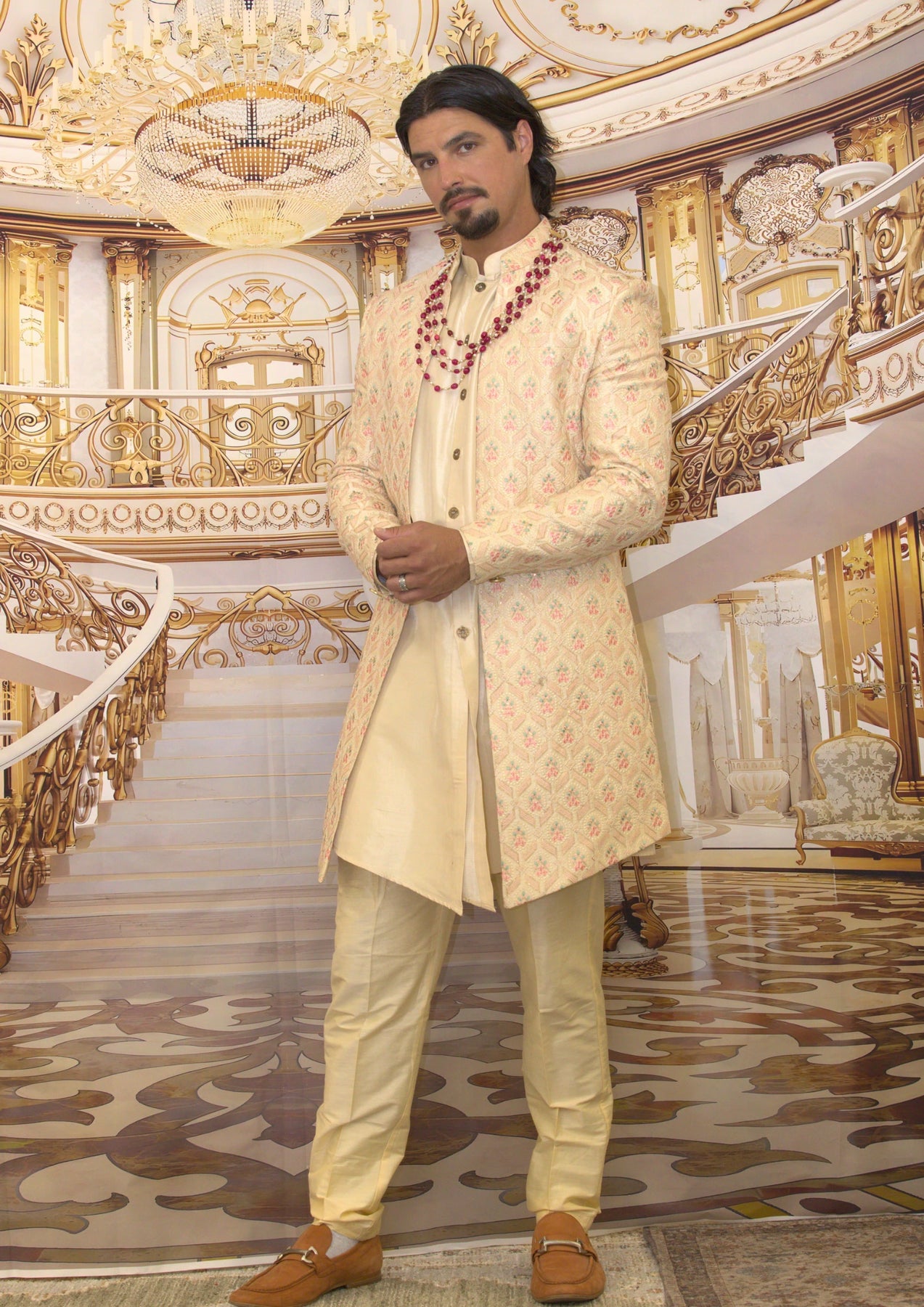Styled here with cream churidar trousers, classic tan juttis, and layered green-bead malas for a contrasting pop of color, this ensemble is perfect for wedding pheras, receptions, or royal-themed celebrations. A timeless blend of tradition and sophistication, it ensures the groom stands out with effortless charm.