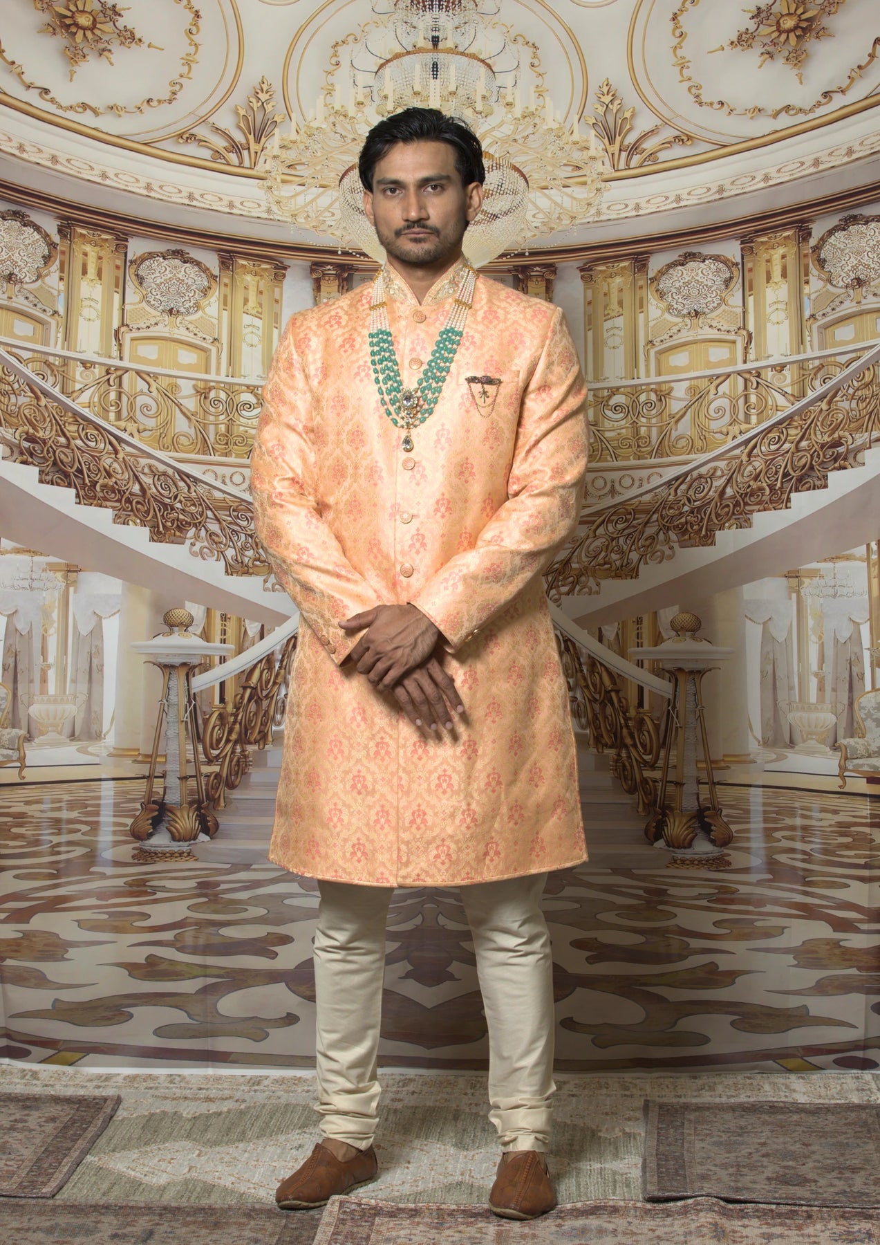 Step into regal sophistication with our Aarav – Ivory Gold Brocade Sherwani, a masterpiece for the modern groom who cherishes timeless tradition. Crafted from luxurious ivory fabric, the sherwani is adorned with intricate gold and soft blush-pink floral brocade motifs, exuding an understated royal charm.