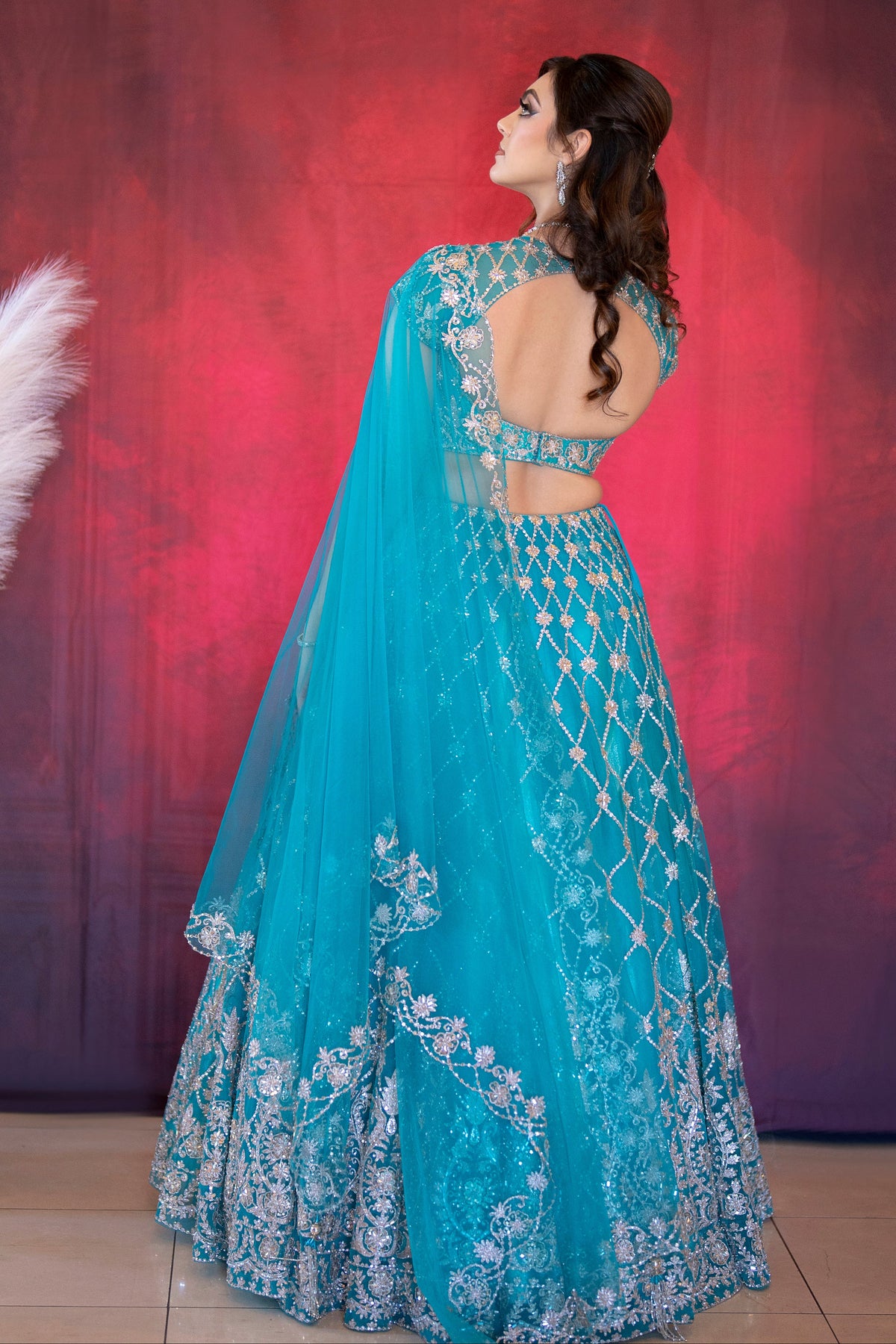 Elevate your beauty with the Magnolias ensemble. Embrace your inner fashionista in this stunning teal Priyanka lehenga adorned with exquisite embroidery and sequins, sure to catch every eye. Pristine elegance meets craftsmanship. A celebration of color and design, the Magnolias ensemble inspires the artist in you. The intricate embroidery and glimmering sequins set you apart, elevating your sense of style with each step.