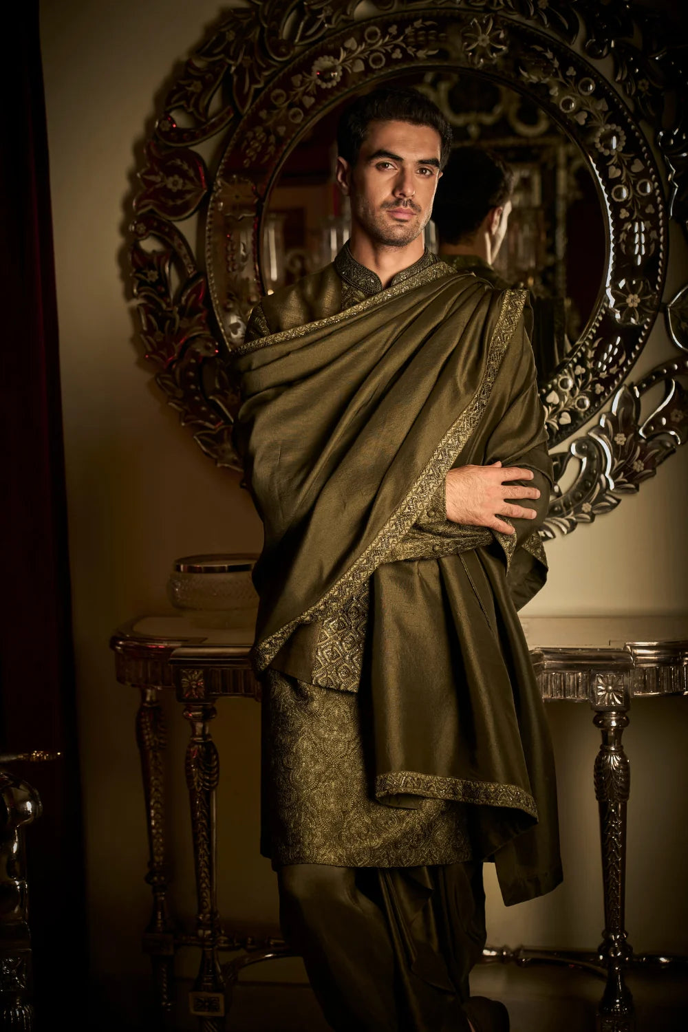 This set features thread work highlighted with french knots and sequin embroidery on the bundi. It is paired with fully embroidered kurta and matching silk dhoti salwar. Complimenting stole and footwear is also available.
