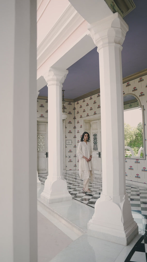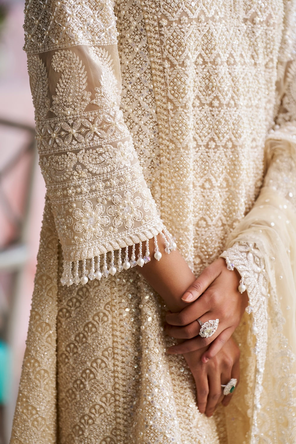 This cream dhoti set features tonal thread, sequin, and pearl embroidery in a geometric pattern. The full sleeves top shows pearl tassels at the wrist as well as at the hem. It is paired with a matching dhoti and an embroidered dupatta with pearl drops on all four sides.
