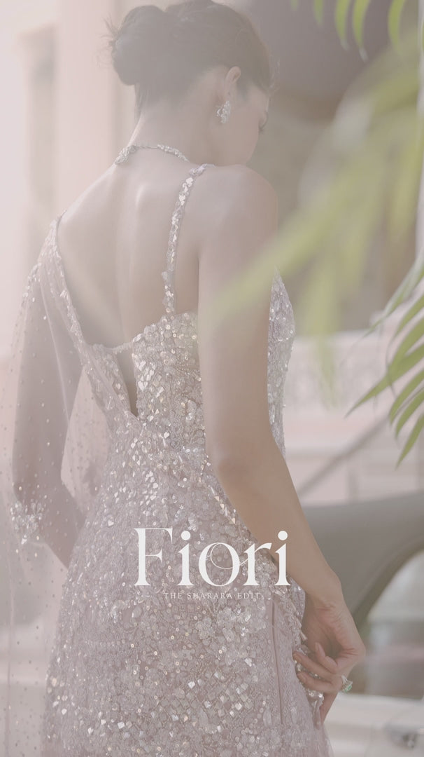 This sharara set features embroidery in tonal, silver sequin and crystal on a mauve net base. The strappy top has delicate crystal tassels at the hem. It is paired with a full embroidered sharara and four sided embroidered net dupatta.