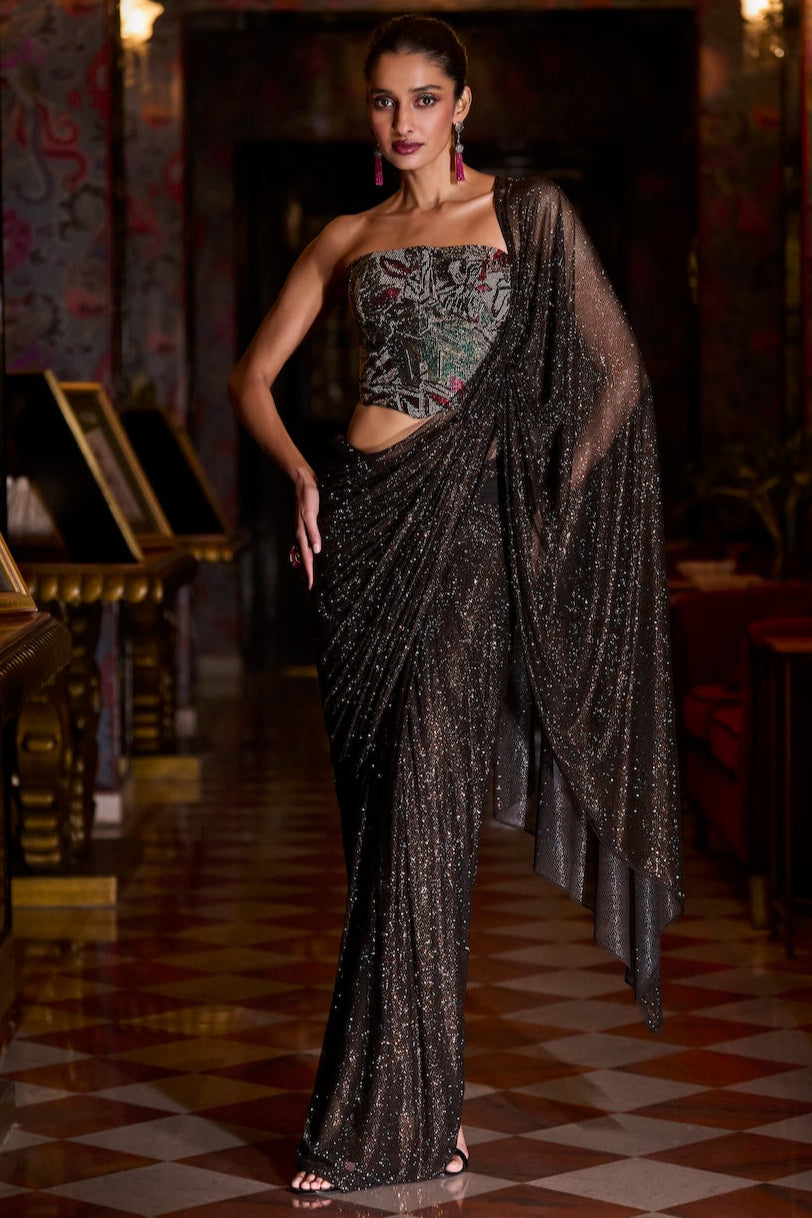 Our fuss free pre-draped saree comes with an attached petticoat. The corset blouse features crystal work in assorted colours. The saree has a flattering silhouette.