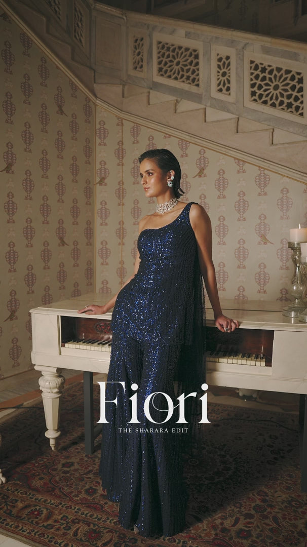 This navy sharara set features heavily embellished platinum cut sequin in a linear pattern. The one shoulder top is paired with an attached net dupatta and an embroidered fitted sharara.