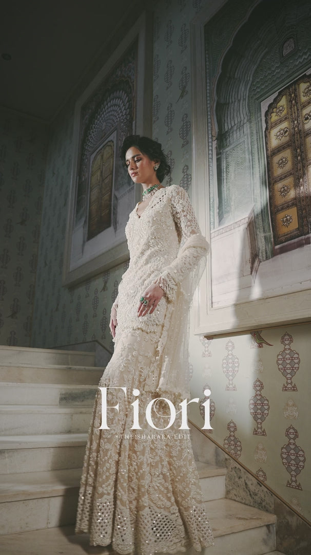 This sharara set features intricate pearl embroidery interspersed with delicate cut work on a nude base. The full sleeves top shows pearl tassels at sleeve hem and is paired with matching embroidered sharara. The scalloped dupatta shows pearl drops.