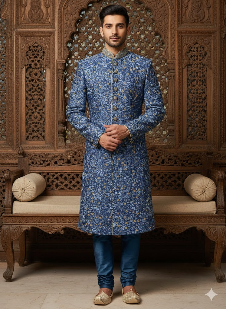 A regal blue sherwani adorned with intricate floral embroidery in gold and silver tones. The high-collared design and detailed buttons exude sophistication, making it perfect for weddings and grand celebrations. The luxurious fabric and rich embroidery make this sherwani a statement piece for any groom or special occasion.