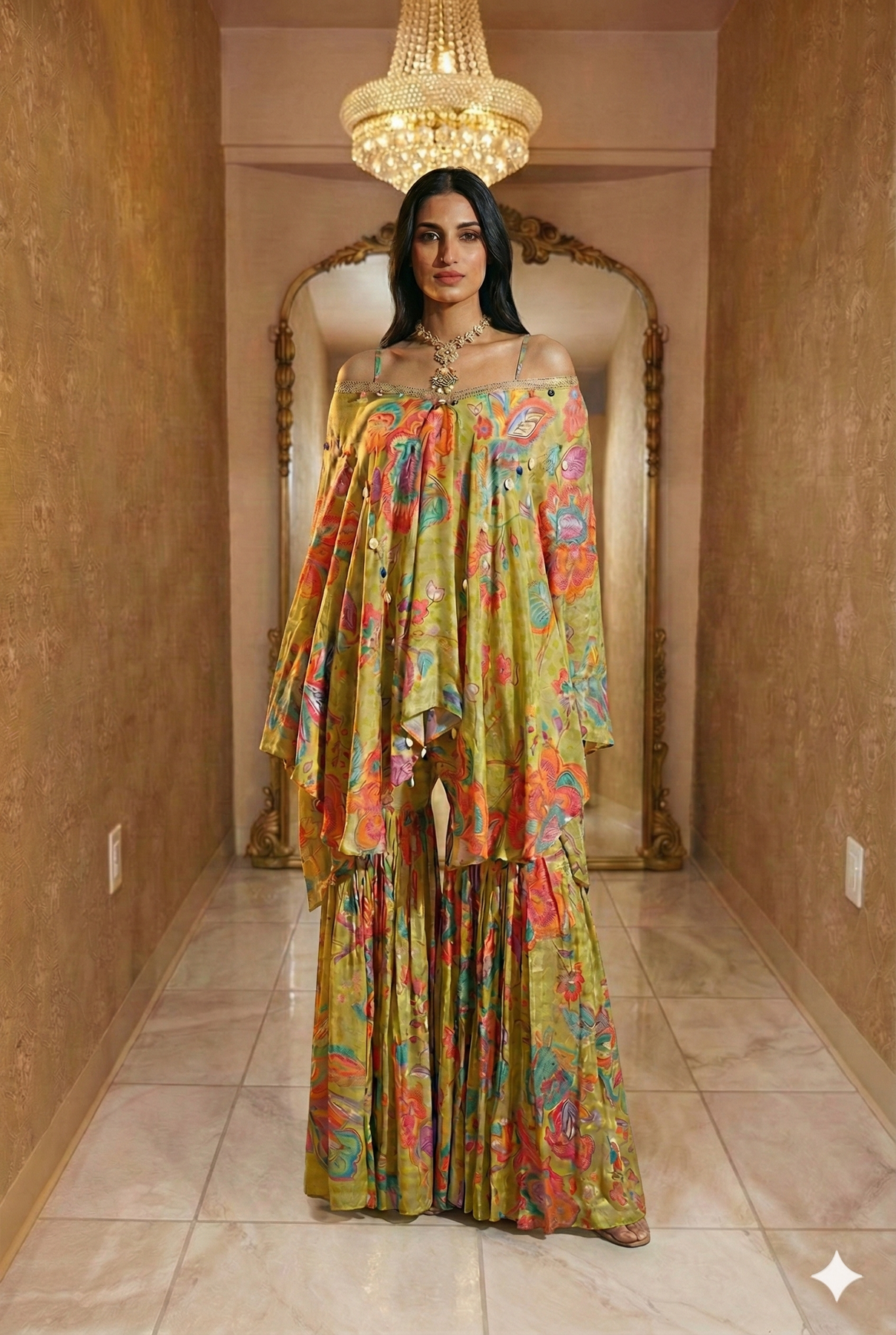 Step into effortless elegance with the VAMA DESIGNS Lime Green Floral Kaftan & Sharara Set. Designed for the modern woman who values comfort without compromising on high-fashion aesthetics, this Indo-western ensemble is a masterpiece of vibrant color and fluid silhouette.