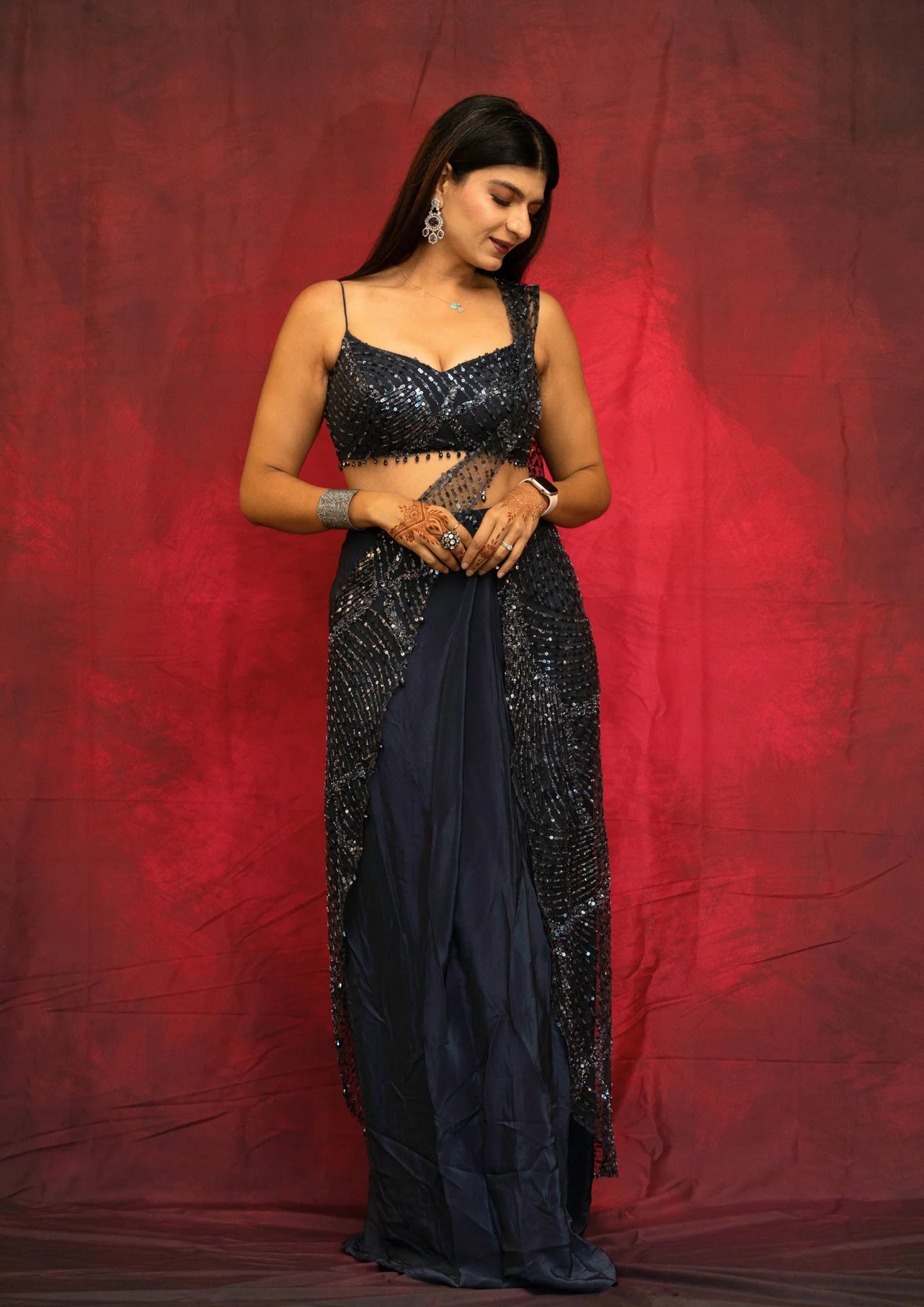 • Saree: Pre-stitched navy base with an asymmetrical, fully sequined drape featuring linear bead and sequin work for a structured, glittering effect.