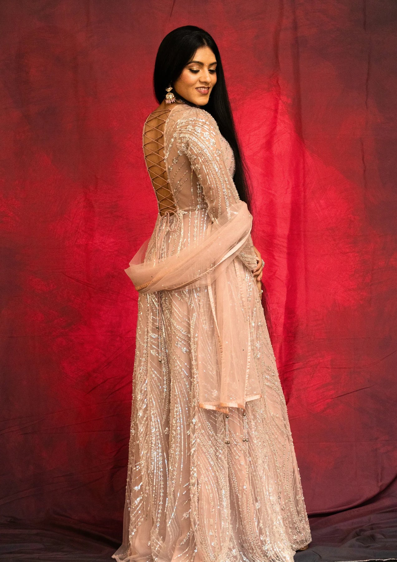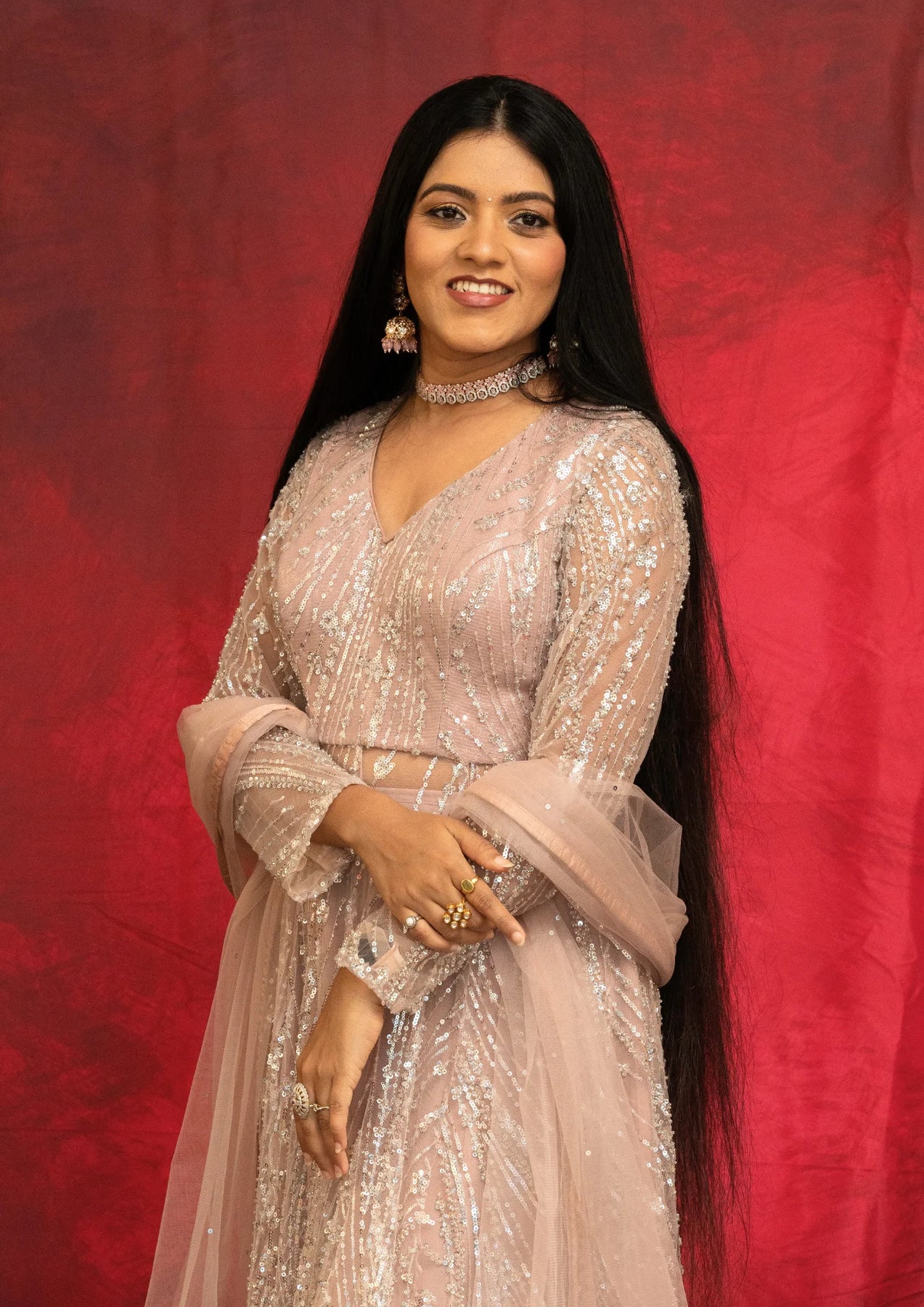 A whisper of romance with starry-glamour, the Saanvi – Blush Starlight Sequin Saree is crafted for the woman who loves soft femininity wrapped in couture sparkle. Rendered in a delicate blush-pink, the saree is lavishly embellished with linear sequin work that fans and ripples across the skirt, creating a sculpted, luminous effect that moves like starlight. The V-neck blouse and sheer full sleeves are similarly adorned, offering a cohesive, modern silhouette that’s both graceful and arresting.