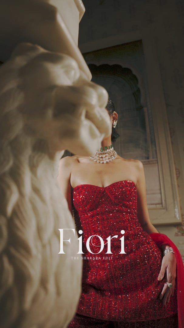 This sharara set features tone on tone embroidery on a red net base. The off shoulder top is paired with a darker toned embroidered sharara with a matching four sided embroidered dupatta.