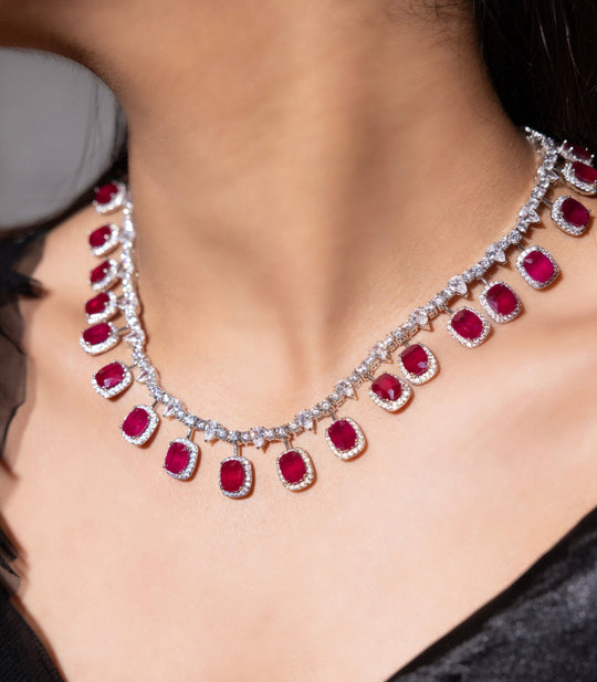 Description: This ruby-toned crystal necklace features a repeating pattern of teardrop motifs in a symmetrical arrangement. Perfect for bridal occasions, receptions, or glamorous evening wear.