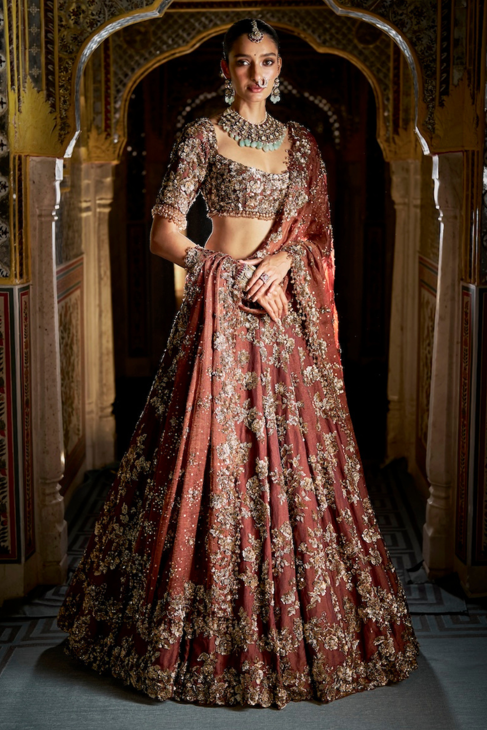 This lehenga set features heavy antique gold embroidery interspersed with bold cut work. The lehenga is further lined with antique gold crush tissue. The blouse shows exaggerated tassels at the sleeve hem, elbow and at the back of the blouse. it is paired with a matching heavy embroidered with tassels on all four sides