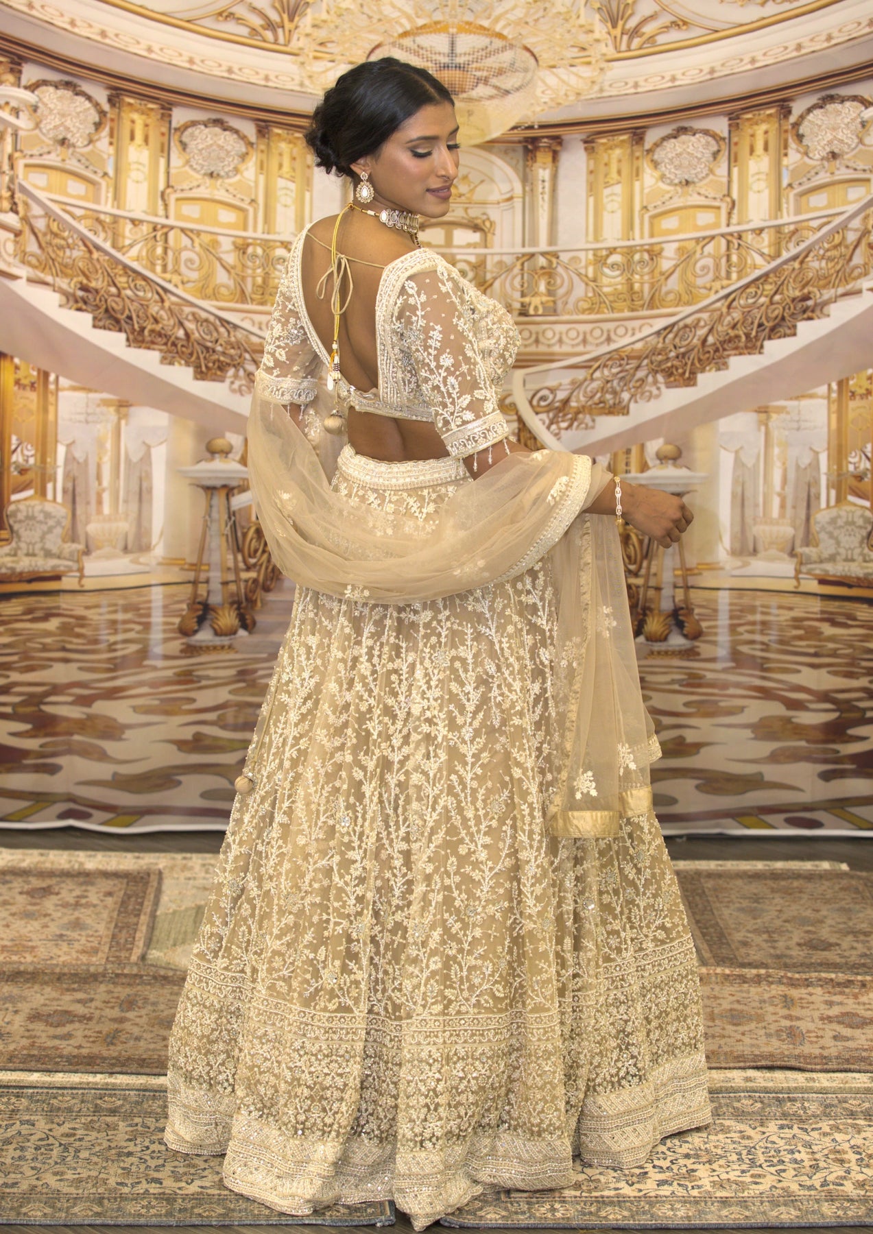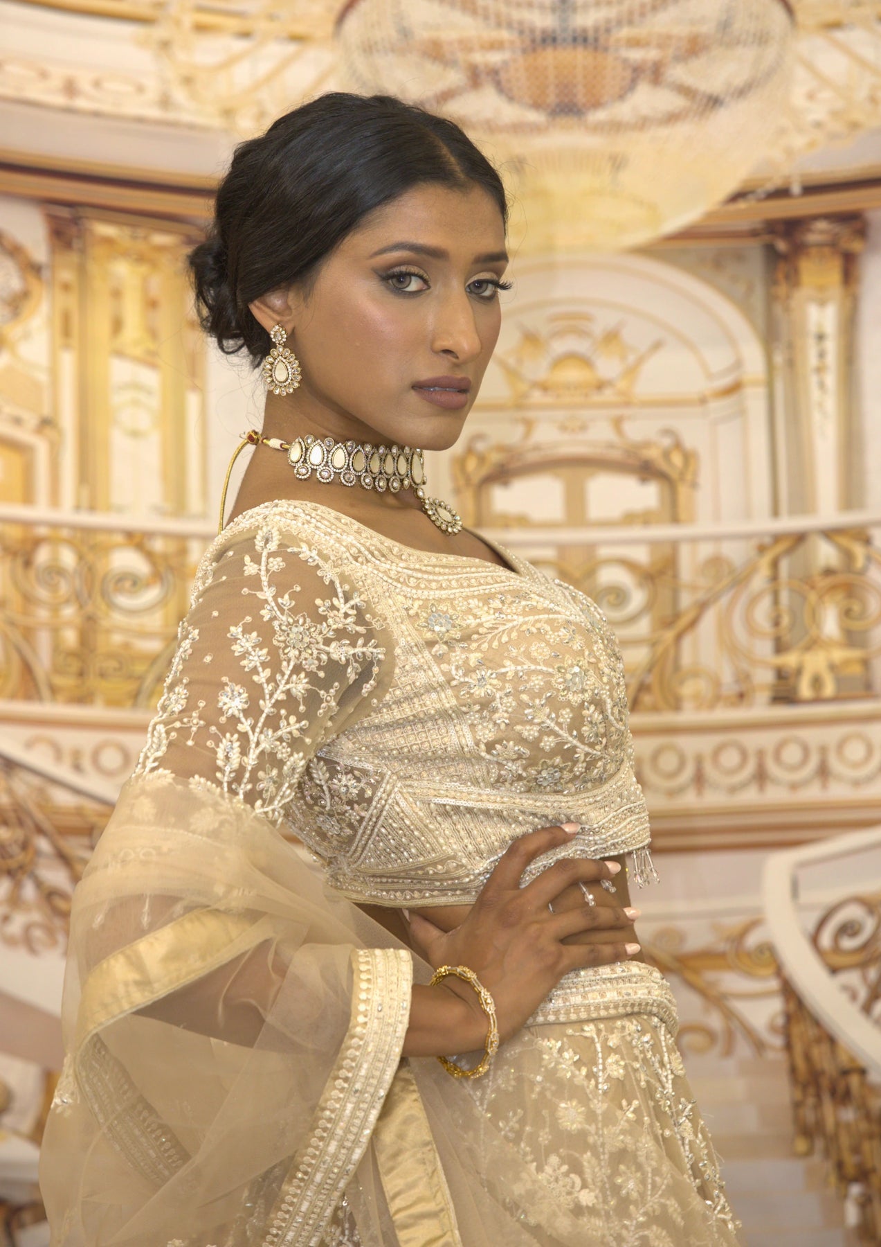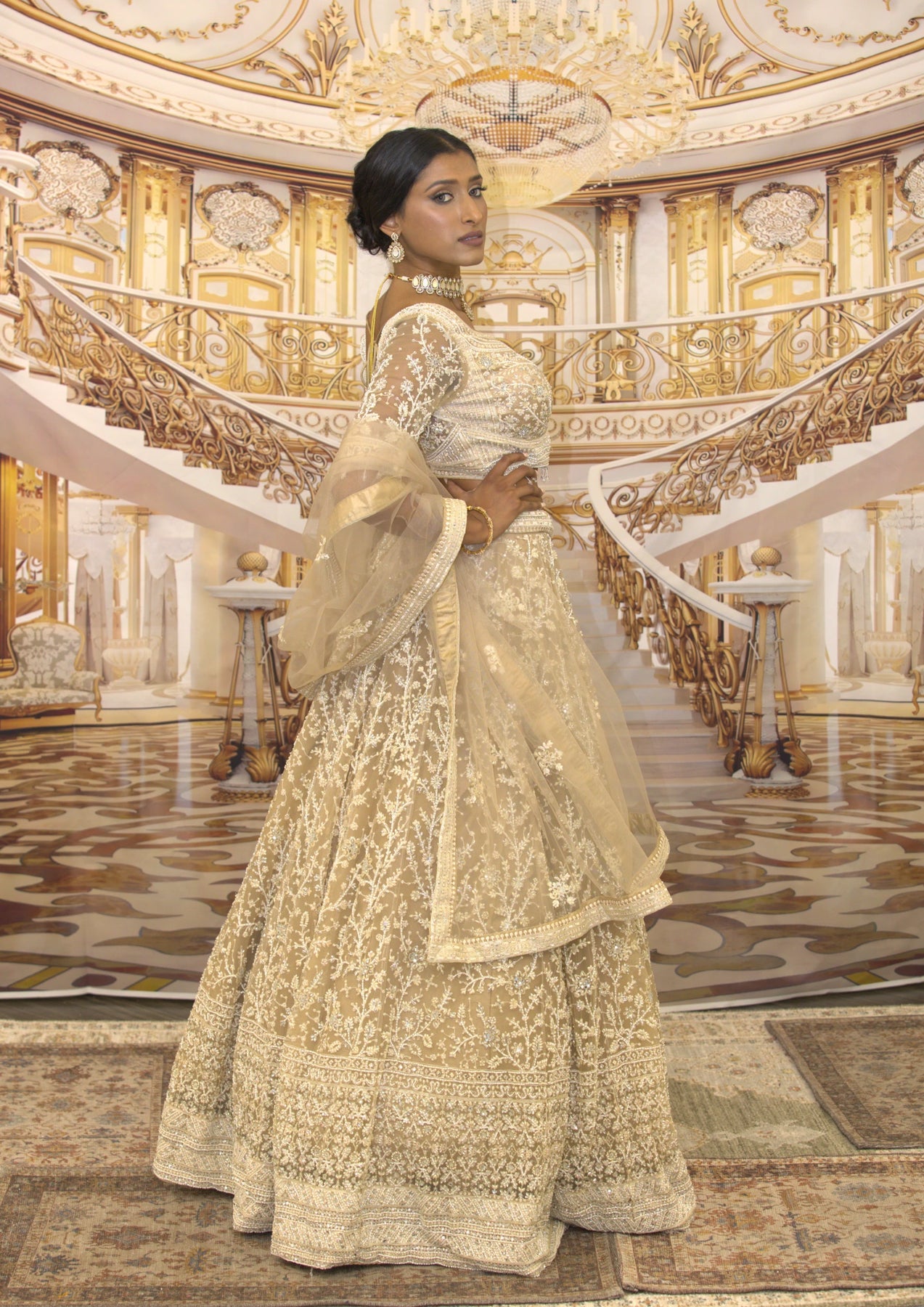 • Fabric & Craft: Luxury net with silk underlay; hand-embroidered in champagne-gold threadwork, resham, and shimmering sequins, crafted with heirloom-level artistry.