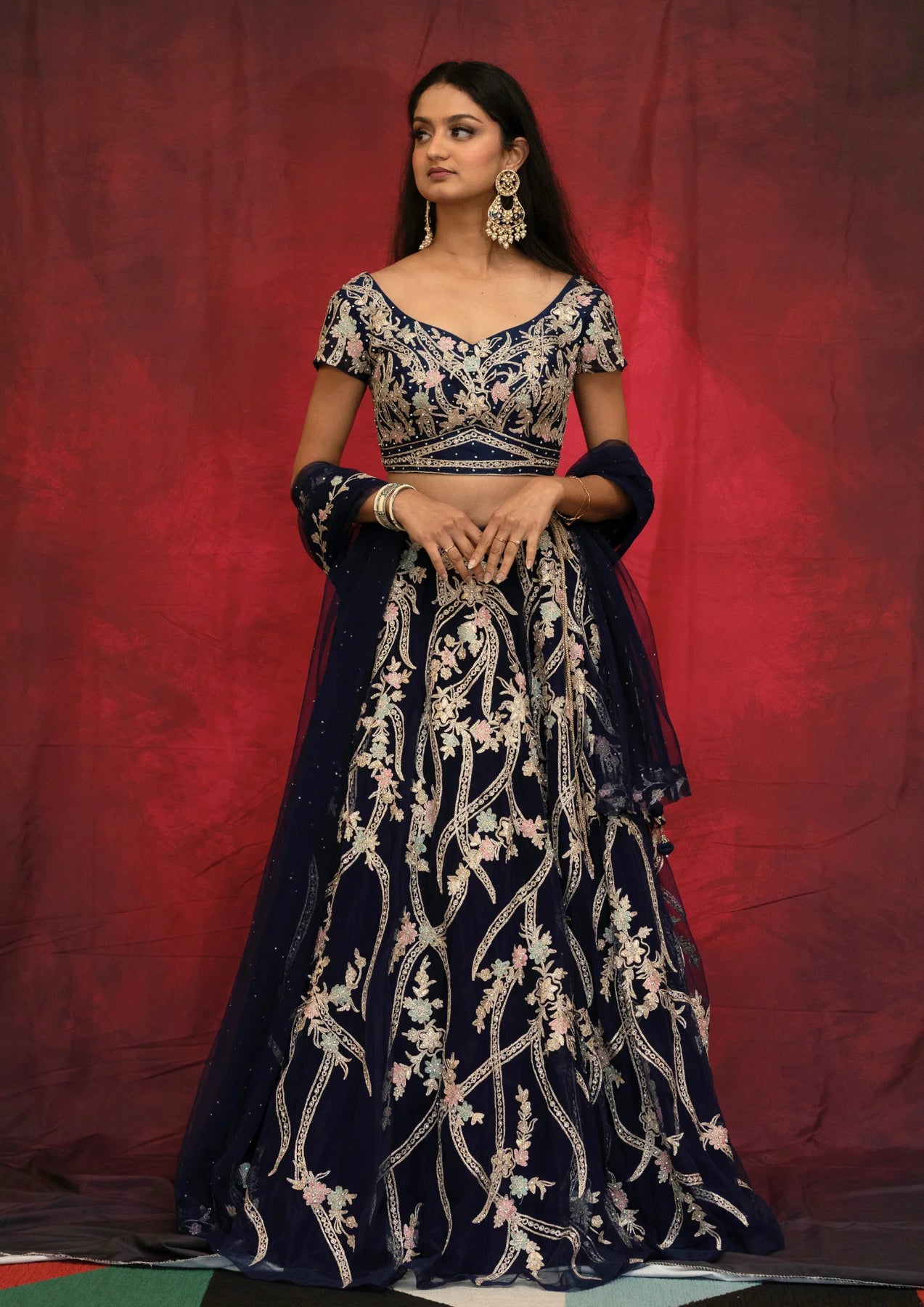 Regal, intricate, and timelessly elegant, the Ishika – Midnight Blossom Embroidered Velvet Lehenga is crafted for the woman who wants to command attention with graceful sophistication. This breathtaking ensemble features a deep midnight navy base, enriched with lavish floral and vine embroidery that cascades organically through the skirt. The artwork is rendered in pastel pinks, muted golds, and soft ivory threads, creating a stunning contrast against the rich dark canvas.