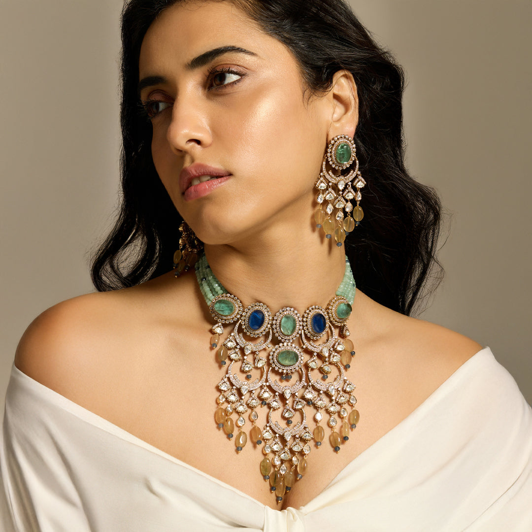 Description: Oceanic Emerald Necklace Set blends the deep hues of green and blue stones in a breathtaking combination, complemented by intricate craftsmanship. This necklace and earring ensemble is perfect for those seeking a bold yet refined look for festive events or bridal occasions. The harmonious mix of colors evokes a sense of regal beauty, making it a standout piece that adds vibrant sophistication to any ensemble.