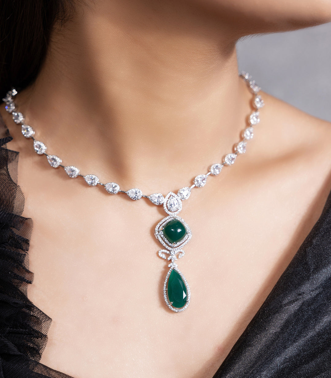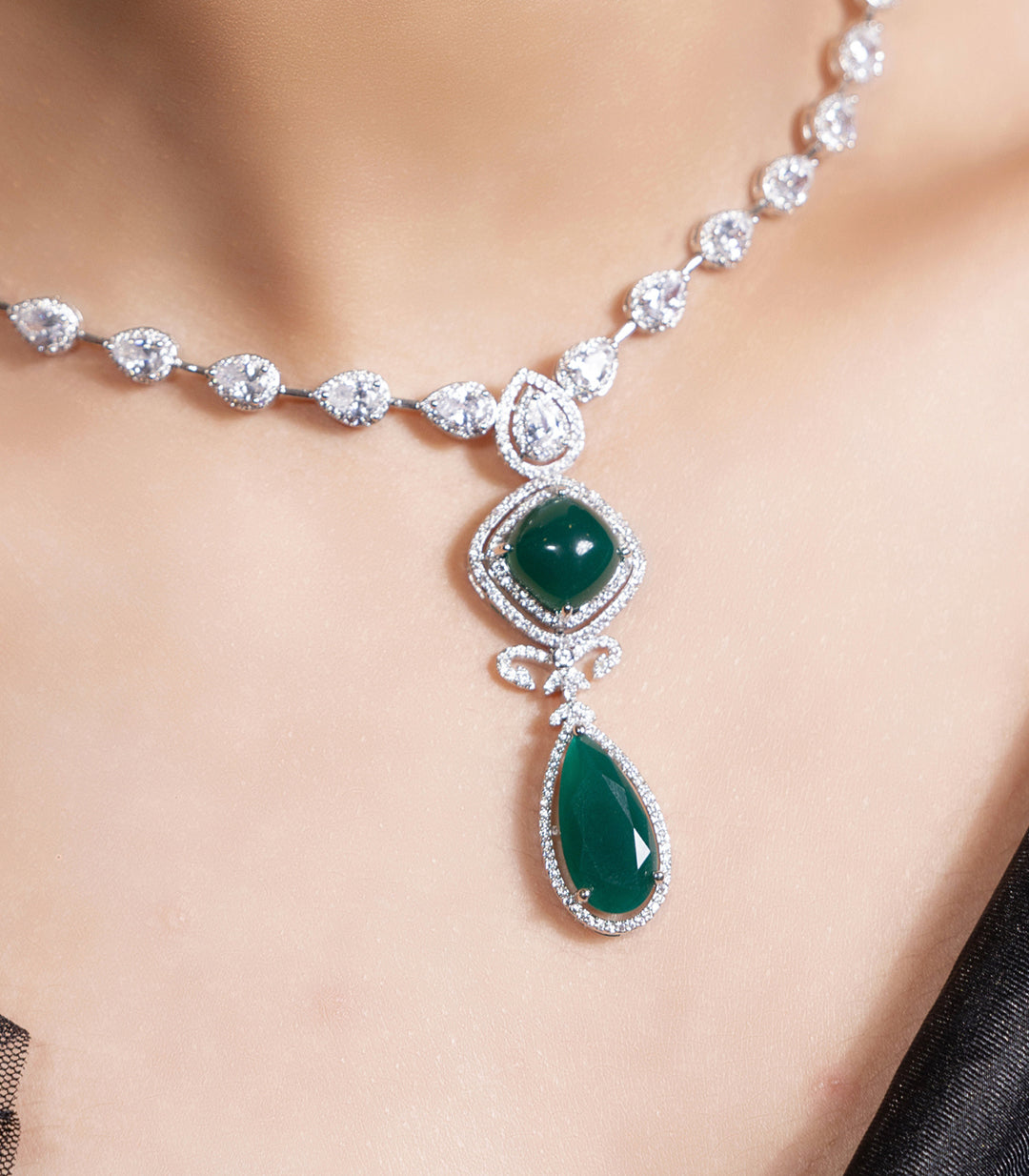 Description: Featuring twin emerald green stones with a crystal link setting, this necklace offers a luxurious yet graceful profile. A standout piece for weddings or modern ethnic dressing.