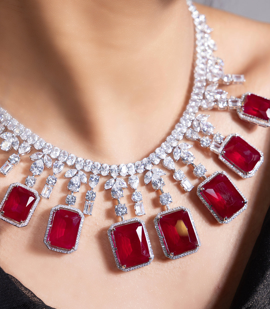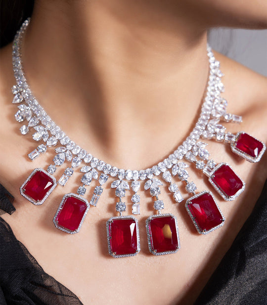 Description: Bold ruby red rectangles, intricately set among layers of glistening stones, create a dramatic silhouette. This piece is perfect for the modern bride or formal high-society galas.