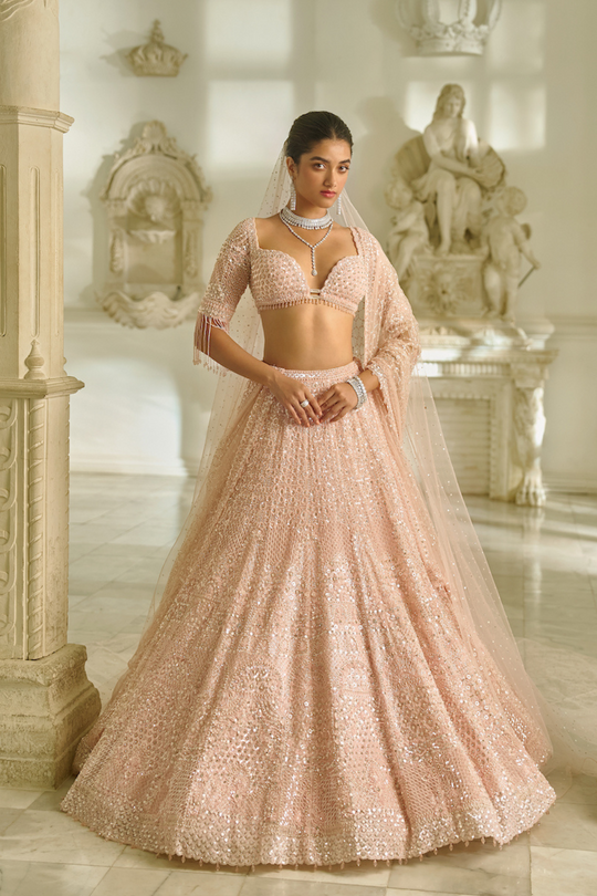 This lehenga set features tonal embroidery in delicate sequin and crystal. The blouse has a plunging neckline with crystal pieces at the center. The elbow sleeves has exaggerated tassels. The four sided embroidered dupatta has an all over jaal as well. The outfit has pink crystal drops.