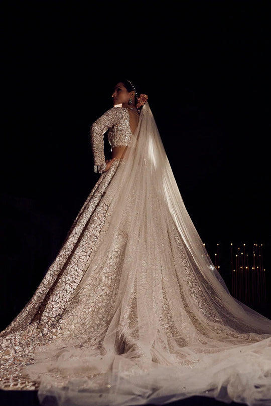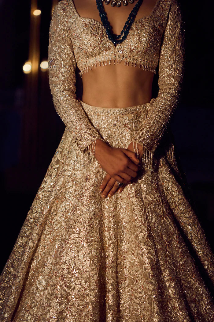 This rose gold lehenga set features all over gota with crystal, pearl, sequin. The outfit is paired with an optional detachable trail, a full sleeves blouse and an embroidered net dupatta with four sided kiran.